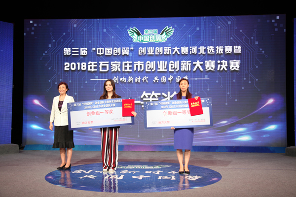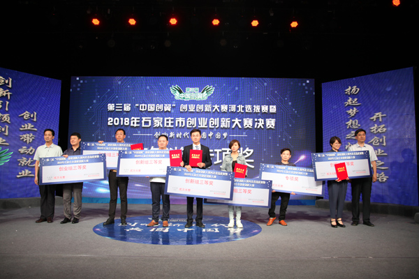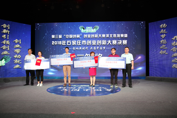 7月10日,第三届“中国创翼”创业创新大赛河北选拔赛暨2018年石家庄市创业创新大赛决赛在石家庄电视台演播大厅圆满落幕。省人社厅副厅长赵爱平,市人社局党组书记、局长王德庆,市人社局党组成员、市就业服务中心主任孟运苍等领导出席活动并为获奖选手颁奖。